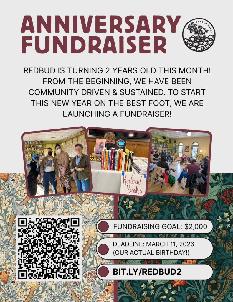 As a community-led non-profit, we’re also a hub for exchanging ideas and building connections: we host themed reading groups, a speaker series, and international film screenings. We recognize that thought itself can be a radical proposition and that books enable other worlds to bloom by inspiring us to think and act otherwise. Redbud isn’t just a bookstore—it’s a portal between local and global, between the known and the unknowable, between the present and what could be. We are a project of the Center for Sustainable Living (CSL).